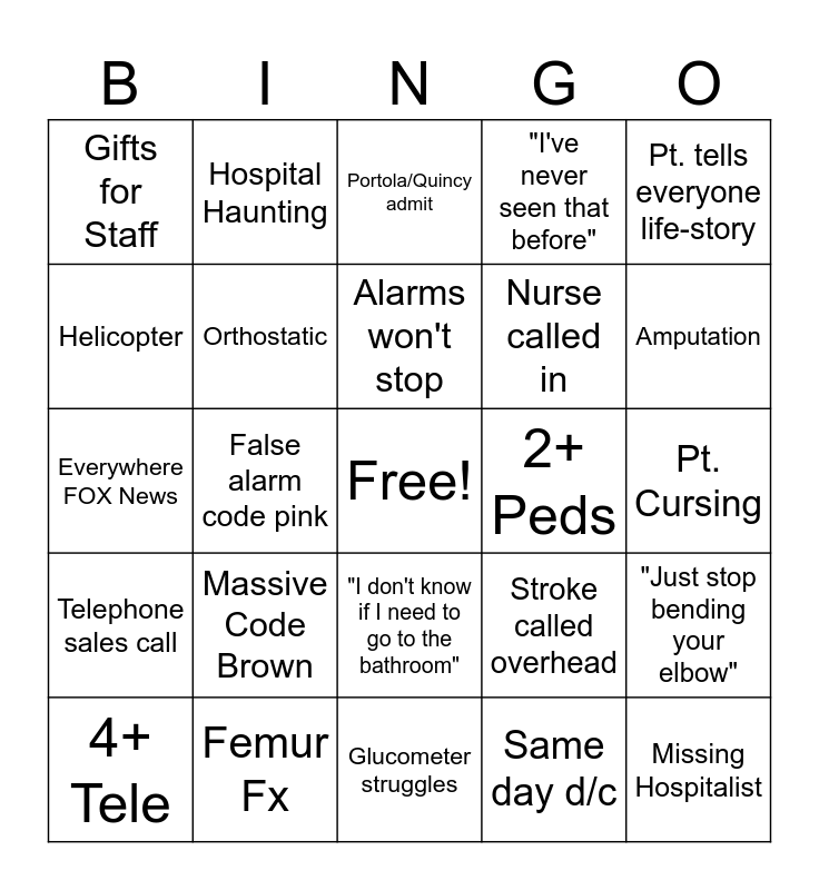 This bingo card has a free space and 24 words: Massive Code Brown, Femur Fx, Alarms won't stop, 4+ Tele, Pt. tells everyone life-story, Gifts for Staff, Helicopter, Hospital Haunting, 2+ Peds, "I don't know if I need to go to the bathroom", Nurse called in, Everywhere FOX News, Stroke called overhead, "Just stop bending your elbow", Orthostatic, Same day d/c, Pt. Cursing, Portola/Quincy admit, Amputation, False alarm code pink, Missing Hospitalist, Telephone sales call, "I've never seen that before" and Glucometer struggles.