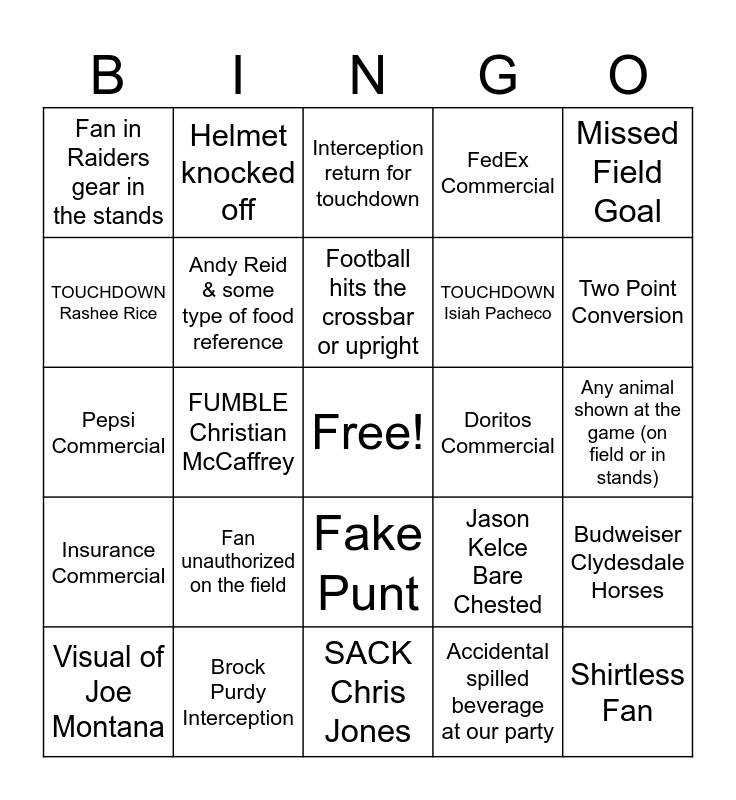 This bingo card has a free space and 27 words: Jason Kelce Bare Chested, Taylor Swift, TOUCHDOWN Isiah Pacheco, SACK Chris Jones, TOUCHDOWN Rashee Rice, Interception return for touchdown, Helmet knocked off, Insurance Commercial, Doritos Commercial, Budweiser Clydesdale Horses, Pepsi Commercial, FedEx Commercial, Visual of Joe Montana, Brock Purdy Interception, Two Point Conversion, Memorial Tribute to Lamar or Norma Hunt, Andy Reid & some type of food reference, Football hits the crossbar or upright, Fan unauthorized on the field, Fan in Raiders gear in the stands, Any animal shown at the game (on field or in stands), Accidental spilled beverage at our party, FUMBLE Christian McCaffrey, Shirtless Fan, Fake Punt, Missed Field Goal and Missed Extra Point.