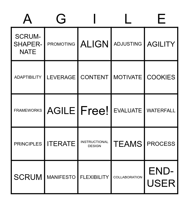 This bingo card has a free space and 29 words: SCRUM, SPRINT, AGILE, AGILE-ALCHEMIST-PIXIE, SCRUM-SHAPER-NATE, ALIGN, LEVERAGE, ITERATE, EVALUATE, MANIFESTO, WATERFALL, END-USER, FLEXIBILITY, COLLABORATION, COOKIES, DEVELOPER, INSTRUCTIONAL DESIGN, PRINCIPLES, AGILITY, FRAMEWORKS, TEAMS, STORIES, MOTIVATE, ADAPTIBILITY, ADJUSTING, PROMOTING, PROCESS, CONTENT and PERFECTION.