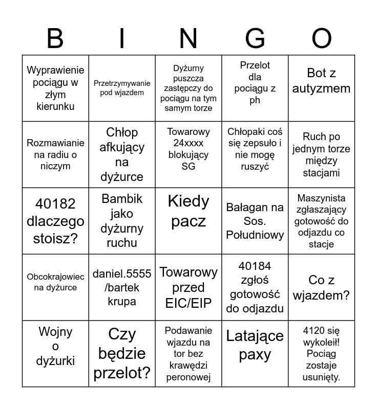 This bingo card has 25 words: daniel.5555 /bartek krupa, Podawanie wjazdu na tor bez krawędzi peronowej, Towarowy 24xxxx blokujący SG, Wojny o dyżurki, Bot z autyzmem, Wyprawienie pociągu w złym kierunku, Rozmawianie na radiu o niczym, Przetrzymywanie pod wjazdem, Bałagan na Sos. Południowy, Towarowy przed EIC/EIP, Chłopaki coś się zepsuło i nie mogę ruszyć, 40182 dlaczego stoisz?, 40184 zgłoś gotowość do odjazdu, Co z wjazdem?, Chłop afkujący na dyżurce, 4120 się wykoleił! Pociąg zostaje usunięty., Maszynista zgłaszający gotowość do odjazdu co stacje, Dyżurny puszcza zastępczy do pociągu na tym samym torze, Ruch po jednym torze między stacjami, Bambik jako dyżurny ruchu, Kiedy pacz, Czy będzie przelot?, Obcokrajowiec na dyżurce, Przelot dla pociągu z ph and Latające paxy.