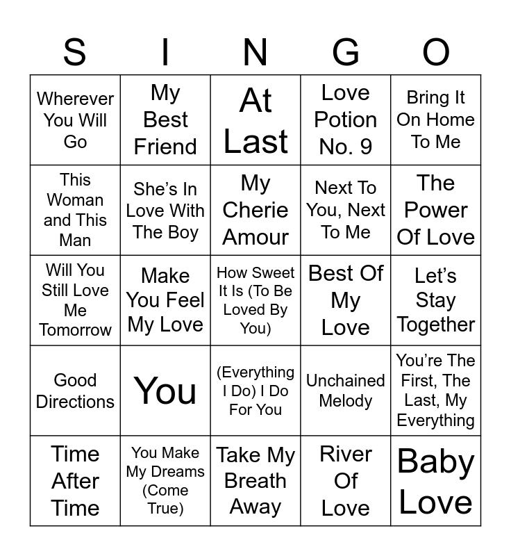 This bingo card has 75 words: Meet In The Middle, When You Say Nothing At All, At Last, Wonderful Tonight, Two Dozen Roses, Hopelessly Devoted, My Girl, You're Still The One, Check Yes Or No, Your Song, Baby Love, Dream A Little Dream Of Me, My Cherie Amour, This Woman and This Man, When A Man Loves A Woman, Make You Feel My Love, Deeper Than The Holler, How Sweet It Is (To Be Loved By You), Save The Last Dance For Me, Bring It On Home To Me, I Will Always Love You, Will You Still Love Me Tomorrow, She’s In Love With The Boy, My Best Friend, Love Potion No. 9, Baby (You’ve Got What It Takes), Livin’ On Love, You Are So Beautiful, Thinking Out Loud, Behind Closed Doors, This Magic Moment, Good Lovin’, Queen Of My Double Wide Trailer, Unchained Melody, The Power Of Love, Next To You, Next To Me, I Can Love You Like That, Your Love Keeps Lifting Me Higher, Let’s Stay Together, River Of Love, I’m Yours, Can’t Help Falling in Love, Cupid, L-O-V-E, I Don’t Want To Miss a Thing, Iris, Time After Time, Wherever You Will Go, No One, Every Breath You Take, Can’t Get Enough Of Your Love, Babe, (Everything I Do) I Do For You, We Belong Together, Always On My Mind, Careless Whisper, With Or Without You, Purple Rain, Be My Baby, If I Could Make A Living, These Arms Of Mine, You, Ordinary People, Ain't No Sunshine, I Say a Little Prayer, Daddy’s Money, Best Of My Love, Total Eclipse of The Heart, Your Man, How Do I Live, You’re The First, The Last, My Everything, Good Directions, You Make My Dreams (Come True), Faithfully, Take My Breath Away and Eternal Flame.