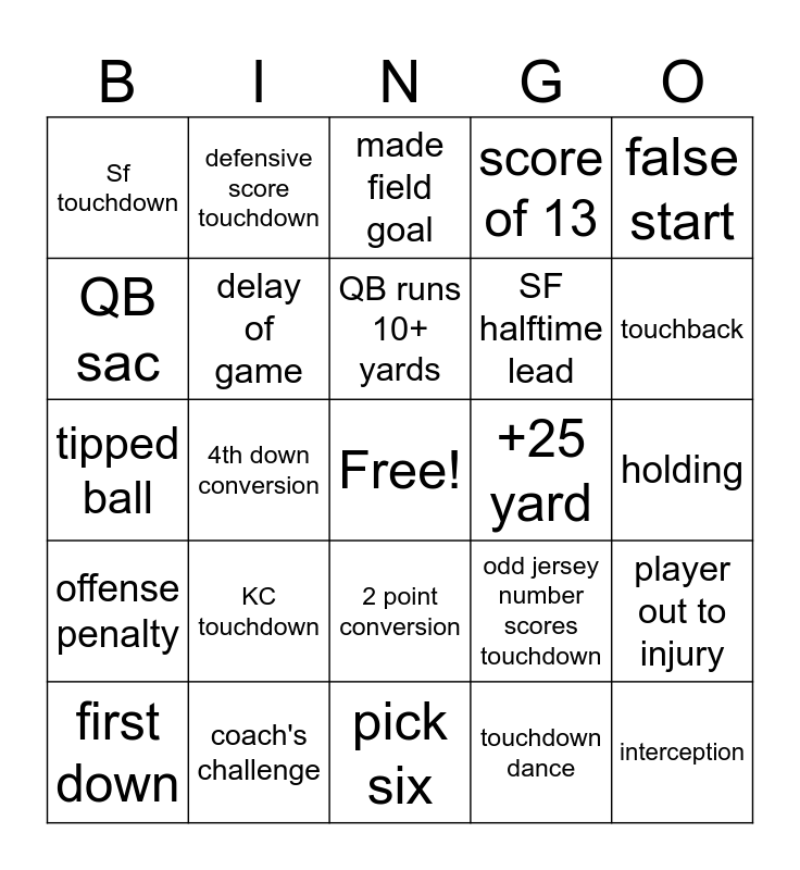 This bingo card has a free space and 34 words: Usher sings "OMG", touchdown dance, KC halftime lead, female ref, offense penalty, delay of game, false start, first down, defensive score touchdown, fumble, QB runs 10+ yards, made field goal, fan with painted face, punt, +25 yard, touchback, coach's challenge, tipped ball, KC touchdown, odd jersey number scores touchdown, 2 point conversion, run for a lose, Sf touchdown, holding, pick six, interception, score of 13, Taylor swift, SF halftime lead, QB sac, defensive penalty, 4th down conversion, player out to injury and even jersey number touchdown.