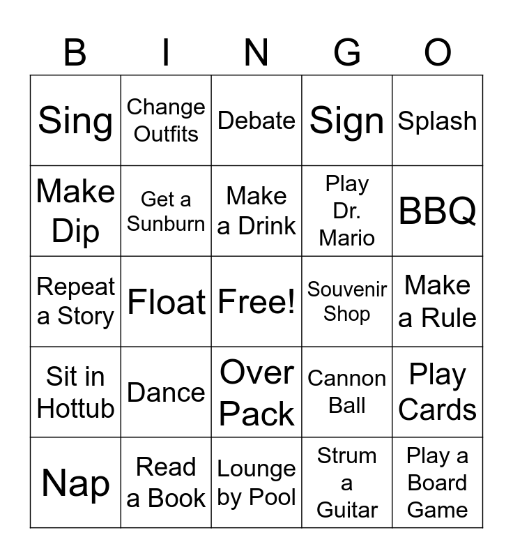 This bingo card has a free space and 24 words: Dance, Read a Book, Make a Drink, Nap, Splash, Sing, Make Dip, Change Outfits, Souvenir Shop, Over Pack, Play Dr. Mario, Repeat a Story, Cannon Ball, Play Cards, Get a Sunburn, Strum a Guitar, Make a Rule, Debate, BBQ, Float, Play a Board Game, Sit in Hottub, Sign and Lounge by Pool.