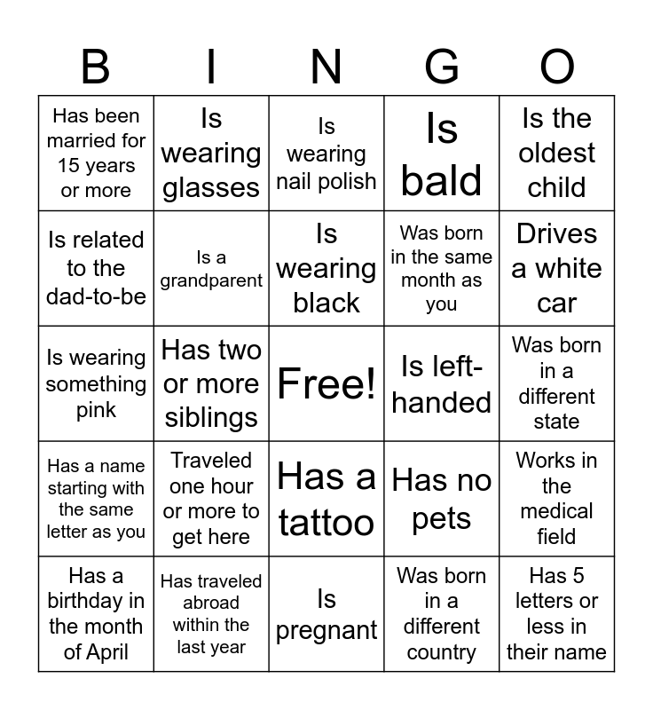 This bingo card has a free space and 24 words: Traveled one hour or more to get here, Has traveled abroad within the last year, Is wearing black, Has a birthday in the month of April, Is the oldest child, Has been married for 15 years or more, Is related to the dad-to-be, Is wearing glasses, Is left-handed, Has a tattoo, Was born in the same month as you, Is wearing something pink, Has no pets, Works in the medical field, Is a grandparent, Was born in a different country, Was born in a different state, Is wearing nail polish, Drives a white car, Has two or more siblings, Has 5 letters or less in their name, Has a name starting with the same letter as you, Is bald and Is pregnant.