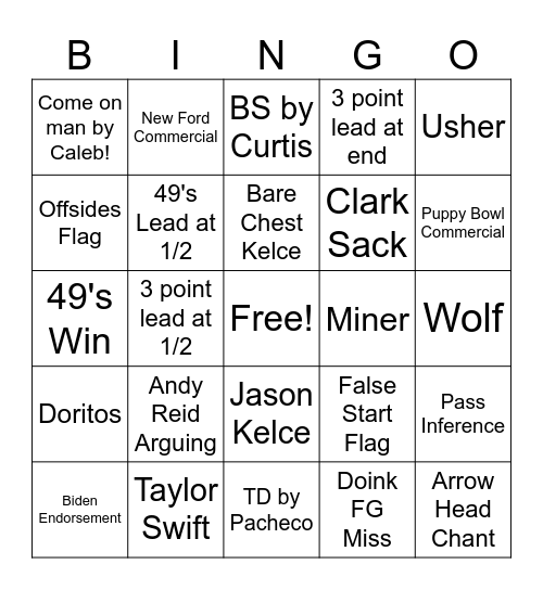 This bingo card has a free space and 41 words: Chiefs Win, 49's Win, Chiefs Lead at 1/2, 49's Lead at 1/2, Taylor Swift, Jason Kelce, Bare Chest Kelce, Clydesdale, Usher, Doritos, 3 point lead at 1/2, 3 point lead at end, Arrow Head Chant, Wolf, Miner, Andy Reid Arguing, Challenge Flag, Come on man by Caleb!, Pizza, BS by Curtis, Pass Inference, TD by Kelce, TD by Pacheco, Clark Sack, Purdy Injury, Bosa Tanturm, Doink FG Miss, SAFETY!, Puppy Bowl Commercial, Cody Not Playing, TURN IT OFF Kari, New Ford Commercial, Biden Endorsement, Wardrobe Malfunction, False Start Flag, Offsides Flag, Tripping Flag, TD Called Back, Pick Six, Interception and TK Proposal.