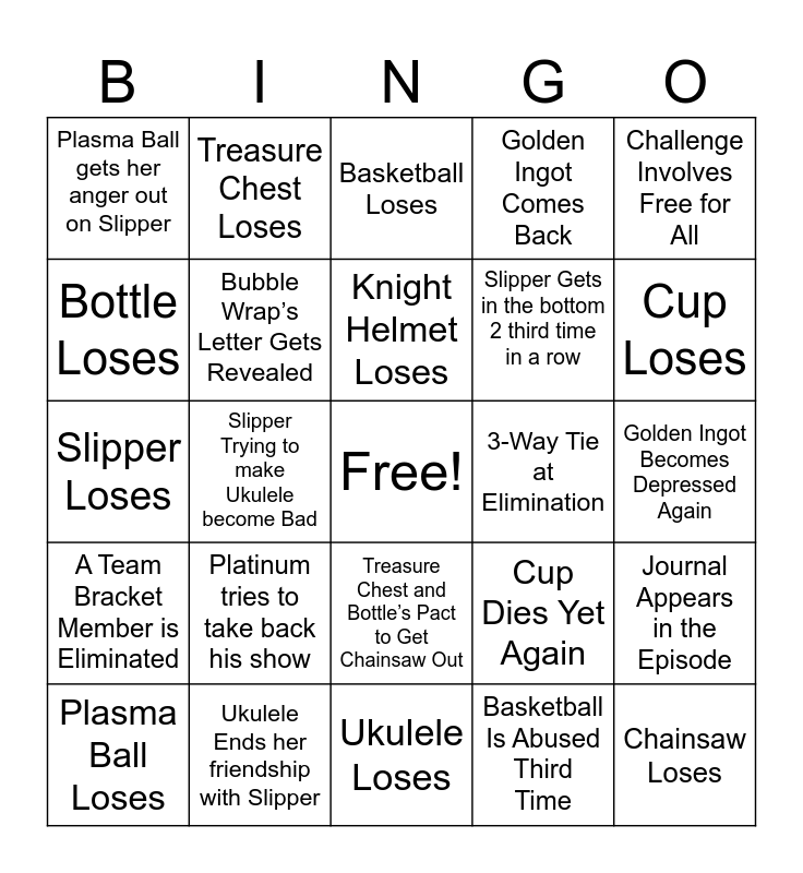 This bingo card has a free space and 24 words: Platinum tries to take back his show, Ukulele Ends her friendship with Slipper, Knight Helmet Loses, Plasma Ball Loses, Challenge Involves Free for All, Plasma Ball gets her anger out on Slipper, Bottle Loses, Treasure Chest Loses, 3-Way Tie at Elimination, Treasure Chest and Bottle’s Pact to Get Chainsaw Out, Slipper Gets in the bottom 2 third time in a row, Slipper Loses, Cup Dies Yet Again, Journal Appears in the Episode, Bubble Wrap’s Letter Gets Revealed, Basketball Is Abused Third Time, Golden Ingot Becomes Depressed Again, Basketball Loses, Cup Loses, Slipper Trying to make Ukulele become Bad, Chainsaw Loses, A Team Bracket Member is Eliminated, Golden Ingot Comes Back and Ukulele Loses.