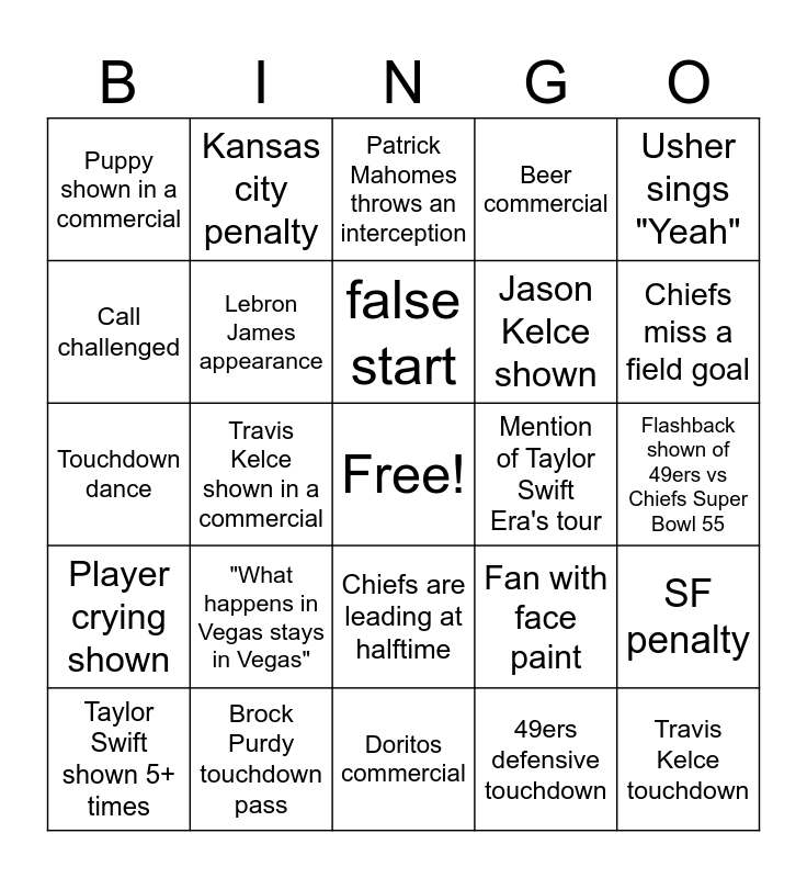 This bingo card has a free space and 29 words: Taylor Swift shown 5+ times, Christian McCaffrey 100+ yards, Travis Kelce shown in a commercial, 49ers score a touchdown, Puppy shown in a commercial, Patrick Mahomes throws an interception, Lebron James appearance, "What happens in Vegas stays in Vegas", Mention of Taylor Swift Era's tour, Brock Purdy touchdown pass, Flashback shown of 49ers vs Chiefs Super Bowl 55, Travis Kelce touchdown, Doritos commercial, 49ers defensive touchdown, Chiefs miss a field goal, QR code shown to scan in a commercial, Chiefs are leading at halftime, Player crying shown, Usher sings "Yeah", Touchdown dance, Fan with face paint, Missed field goal, Jason Kelce shown, Call challenged, Beer commercial, Kansas city penalty, SF penalty, false start and car commercial.