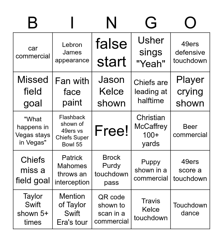 This bingo card has a free space and 29 words: Taylor Swift shown 5+ times, Kansas city penalty, Flashback shown of 49ers vs Chiefs Super Bowl 55, Call challenged, car commercial, false start, Fan with face paint, Patrick Mahomes throws an interception, Christian McCaffrey 100+ yards, Mention of Taylor Swift Era's tour, Beer commercial, Touchdown dance, QR code shown to scan in a commercial, Travis Kelce touchdown, Player crying shown, Travis Kelce shown in a commercial, Brock Purdy touchdown pass, Chiefs miss a field goal, 49ers defensive touchdown, "What happens in Vegas stays in Vegas", Puppy shown in a commercial, SF penalty, Chiefs are leading at halftime, Missed field goal, Usher sings "Yeah", Lebron James appearance, 49ers score a touchdown, Jason Kelce shown and Doritos commercial.