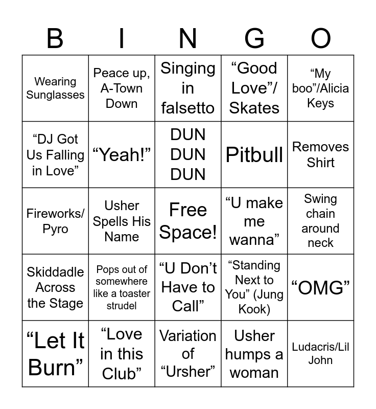 This bingo card has a free space and 24 words: “Let It Burn”, Pops out of somewhere like a toaster strudel, DUN DUN DUN, Usher humps a woman, “My boo”/Alicia Keys, Wearing Sunglasses, Peace up, A-Town Down, Singing in falsetto, “U make me wanna”, Swing chain around neck, Fireworks/ Pyro, “Yeah!”, “Standing Next to You” (Jung Kook), “OMG”, “DJ Got Us Falling in Love”, “Love in this Club”, Variation of “Ursher”, “Good Love”/ Skates, Removes Shirt, Skiddadle Across the Stage, Usher Spells His Name, “U Don’t Have to Call”, Pitbull and Ludacris/Lil John.