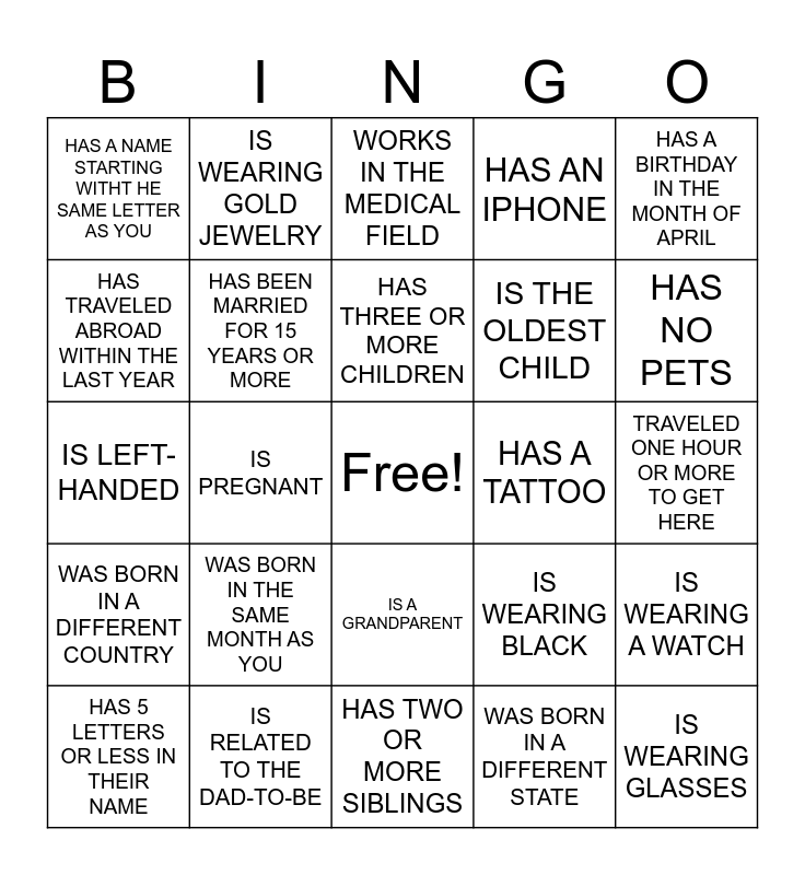 This bingo card has a free space and 29 words: HAS 5 LETTERS OR LESS IN THEIR NAME, IS WEARING SOMETHING PINK, IS PREGNANT, IS WEARING NAIL POLISH, HAS A NAME STARTING WITHT HE SAME LETTER AS YOU, WORKS IN THE MEDICAL FIELD, HAS BEEN MARRIED FOR 15 YEARS OR MORE, WAS BORN IN THE SAME MONTH AS YOU, HAS A TATTOO, IS RELATED TO THE DAD-TO-BE, TRAVELED ONE HOUR OR MORE TO GET HERE, IS WEARING GLASSES, HAS TWO OR MORE SIBLINGS, WAS BORN IN A DIFFERENT STATE, HAS NO PETS, IS BALD, IS A GRANDPARENT, WAS BORN IN A DIFFERENT COUNTRY, HAS A BIRTHDAY IN THE MONTH OF APRIL, IS LEFT-HANDED, IS WEARING BLACK, DRIVES A WHITE CAR, IS THE OLDEST CHILD, HAS TRAVELED ABROAD WITHIN THE LAST YEAR, HAS AN IPHONE, IS WEARING GOLD JEWELRY, IS WEARING A WATCH, HAS THREE OR MORE CHILDREN and IS THE SAME AGE AS YOU.