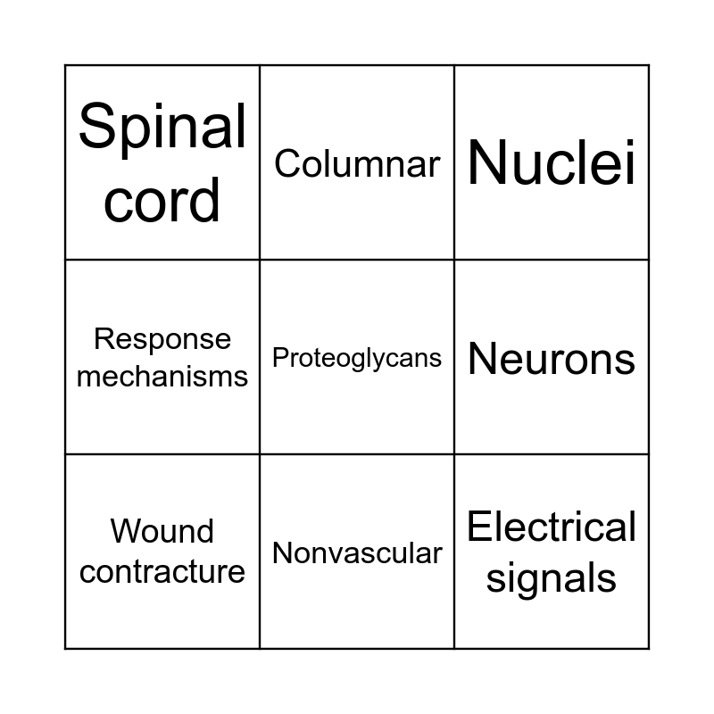 This bingo card has 66 words: Free!, Exocrine glands, Squamous, Hemidesmosomes, Gap Junctions, Stratified epithelium, Columnar, Basal Membrane, Nonvascular, Cuboidal, Keratinized, Matrix, Nonmotile cells, Proteoglycans, Action potential, Neurons, Brain, Spinal cord, Glia, Electrical signals, Nerves, Axon, Response mechanisms, Cutaneous, Serous, Synovial, Mucous, Skin, Inflammation, Chemical Mediators, Histamine, Prostaglandins, Edema, Neutrophil, Regeneration, Fibrosis, Clot, Scab, Stem cells, Granulation tissue, Wound contracture, Aging, Synthesis, Collagen, Elasticity, Plaques, Calcium, Wrinkles, Flexible, Lipids, Calcium, Ground substance, Hemopoietic, Fat cells, Recoil, Lacunae, Epiglottis, Pubic symphysis, Nuclei, Intercalated disks, Skeleton, Hollow organs, Involuntary, Striated, Cardiac and Gap junctions.