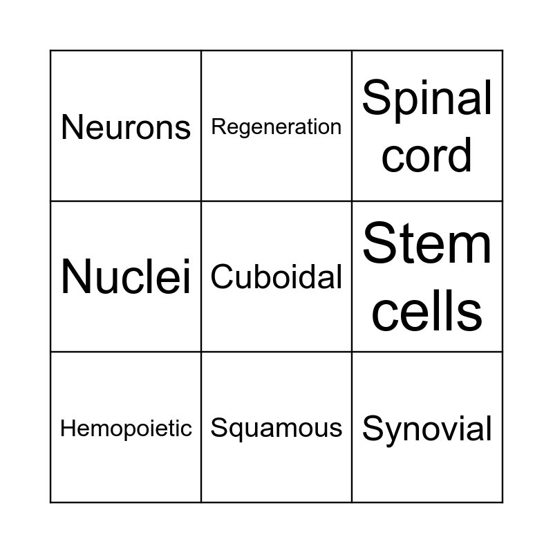 This bingo card has 41 words: Matrix, Lacunae, Recoil, Hemopoietic, Epiglottis, Exocrine gland, Squamous, Hemidesmosomes, Cuboidal, Gap Junctions, Nonvascular, Nuclei, Skeleton, Hollow organs, Involuntary, Striated, Action potential, Neurons, Brain, Spinal cord, Glia, Cutaneous, Serous, Synovial, Mucous, Skin, Inflammation, Histamine, Prostaglandins, Edema, Neutrophil, Regeneration, Fibrosis, Clot, Scab, Stem cells, Aging, Synthesis, Collagen, Elasticity and Plaques.