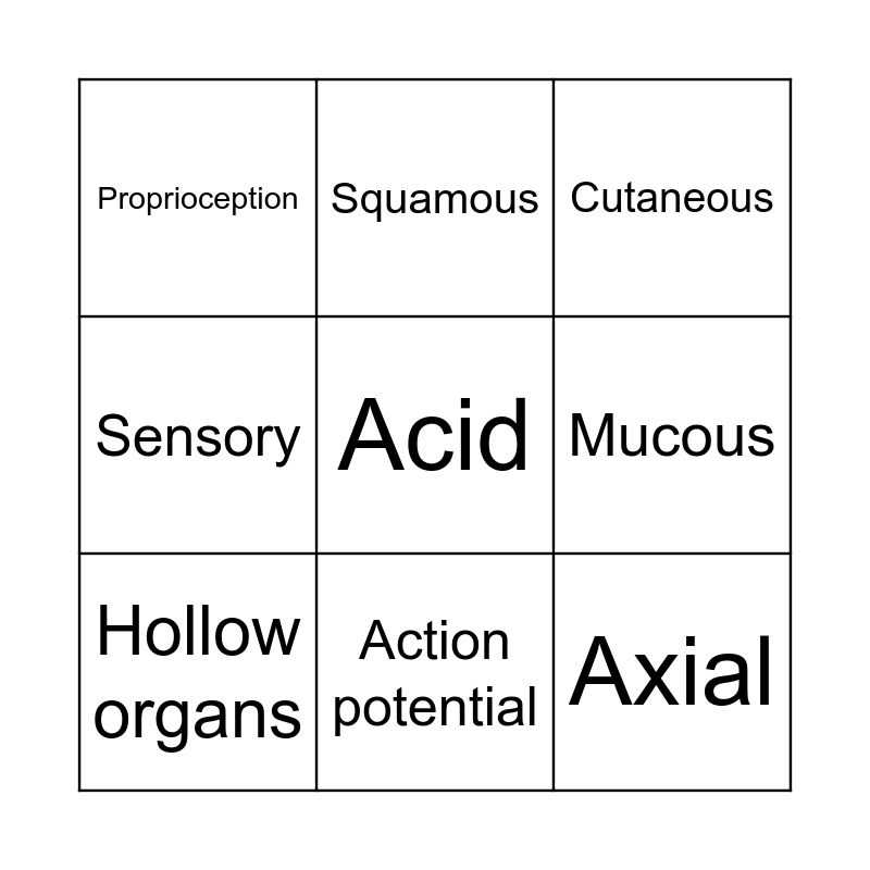 This bingo card has 56 words: Scab, Plaques, Anaphase, Proprioception, Edema, Spinal cord, Hollow organs, Skin, Axial, Involuntary, Sensory, Homeostasis, Nuclei, Elasticity, Hemopoietic, Collagen, Acid, Synovial, Adenoid, Mitosis, Nonvascular, Lacteals, Glia, Cutaneous, Specificity, Action potential, Inflammation, Matrix, Lacunae, Dissociation, Epiglottis, Prostaglandins, Norepinephrine, Striated, Histamine, Mucous, Cuboidal, Neutrophil, Meiosis, Squamous, Neurons, Serous, Regeneration, Skeleton, Stem cells, Zygomatic, Translation, Hemidesmosomes, Brain, Aging, Fibrosis, Clot, Buffer, DNA, Genotype and Gap Junctions.