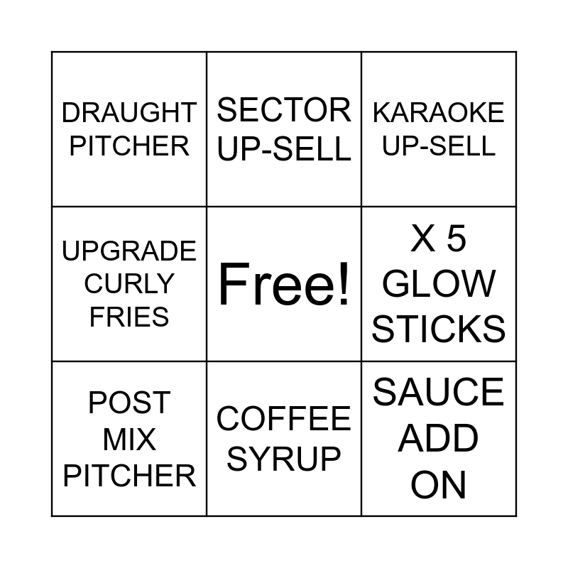 This bingo card has a free space and 8 words: X 5 GLOW STICKS, KARAOKE UP-SELL, SECTOR UP-SELL, POST MIX PITCHER, DRAUGHT PITCHER, SAUCE ADD ON, UPGRADE CURLY FRIES and COFFEE SYRUP.