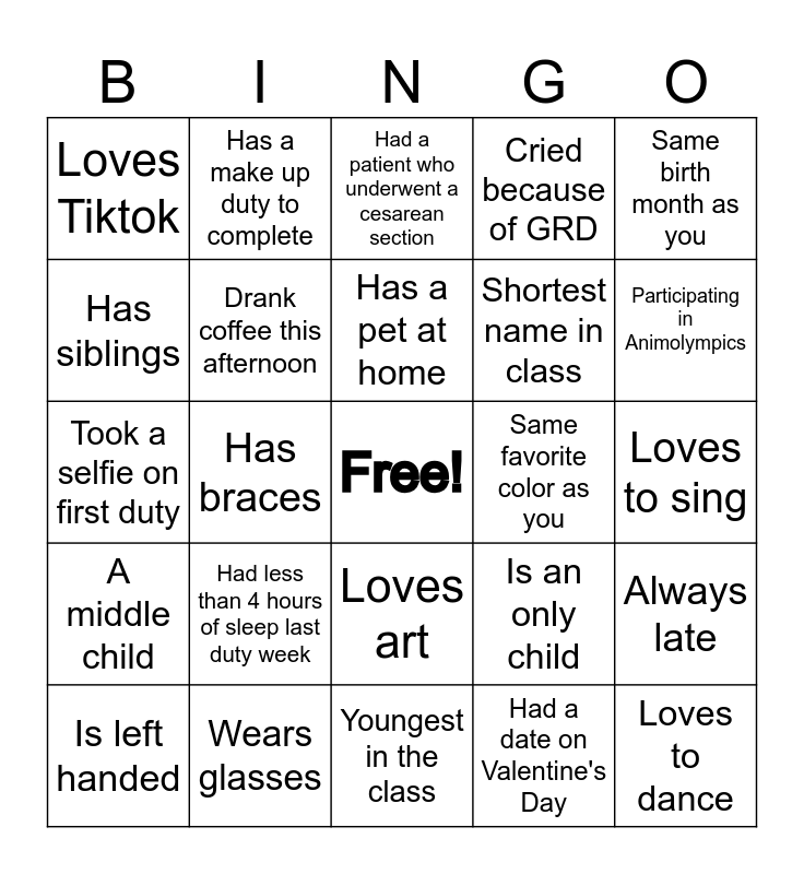 This bingo card has a free space and 24 words: Had less than 4 hours of sleep last duty week, Wears glasses, Has a pet at home, Is left handed, Same birth month as you, Loves Tiktok, Has siblings, Has a make up duty to complete, Same favorite color as you, Loves art, Shortest name in class, Took a selfie on first duty, Is an only child, Always late, Drank coffee this afternoon, Had a date on Valentine's Day, Loves to sing, Had a patient who underwent a cesarean section, Participating in Animolympics, Has braces, Loves to dance, A middle child, Cried because of GRD and Youngest in the class.