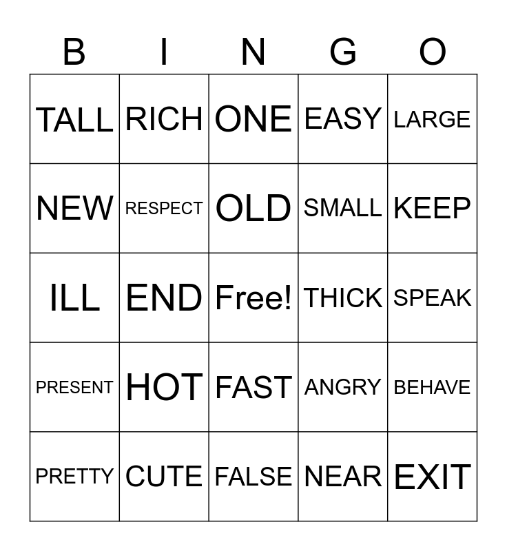 This bingo card has a free space and 24 words: HOT, CUTE, OLD, PRETTY, LARGE, TALL, NEW, RICH, THICK, FAST, SMALL, ILL, ANGRY, BEHAVE, RESPECT, NEAR, SPEAK, ONE, KEEP, END, EXIT, PRESENT, EASY and FALSE.