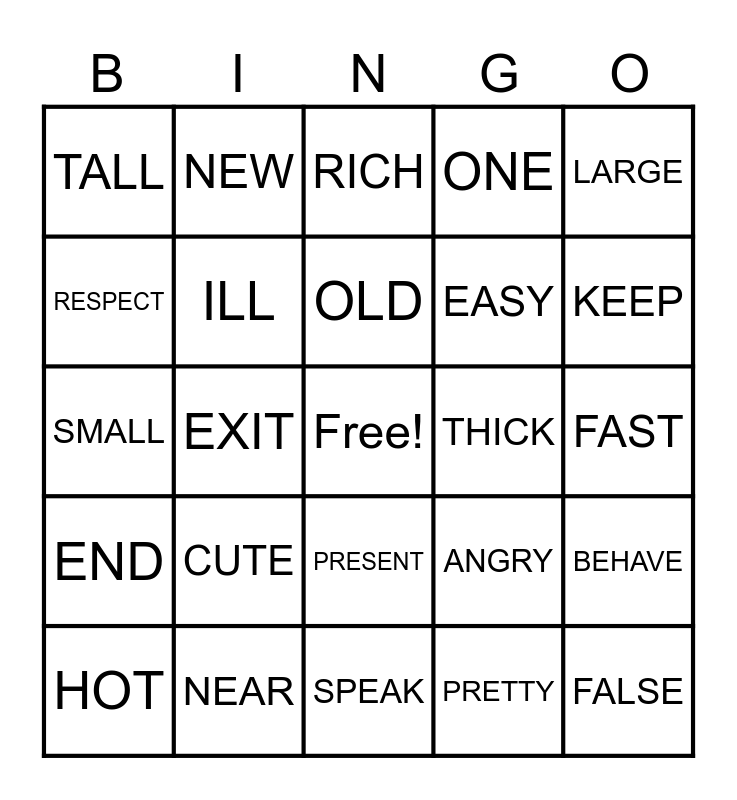 This bingo card has a free space and 24 words: HOT, CUTE, OLD, PRETTY, LARGE, TALL, NEW, RICH, THICK, FAST, SMALL, ILL, ANGRY, BEHAVE, RESPECT, NEAR, SPEAK, ONE, KEEP, END, EXIT, PRESENT, EASY and FALSE.