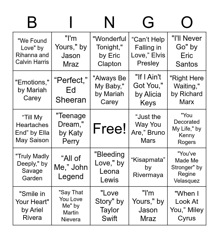 This bingo card has a free space and 56 words: “I Will Always Love You,” Whitney Houston, “All of Me,” John Legend, “Your Song,” Elton John, “Can’t Help Falling in Love,” Elvis Presley, "When I Look At You,” Miley Cyrus, “I Don’t Want to Miss a Thing,” Aerosmith, “Perfect,” Ed Sheeran, “Because You Loved Me,” Celine Dion, “Just the Way You Are,” Bruno Mars, “Lover,” Taylor Swift, "We Found Love" by Rihanna and Calvin Harris, "How Deep is Your Love" by the Bee Gees, "Love Story" by Taylor Swift, "My Heart Will Go On," by Celine Dion, "You're Still the One," by Shania Twain, "Amazed," by Lonestar, "I'm Yours," by Jason Mraz, "Wonderful Tonight," by Eric Clapton, "The Power of Love," by Celine Dion, "Right Here Waiting," by Richard Marx, "Truly Madly Deeply," by Savage Garden, "From This Moment On," by Shania Twain, "Always Be My Baby," by Mariah Carey, "If I Ain't Got You," by Alicia Keys, "Tagpuan" by Moira Dela Torre, “Till My Heartaches End” by Ella May Saison, “Ikaw” by Yeng Constantino, “Tuloy Pa Rin” by Neocolours, “Kisapmata” by Rivermaya, ‘Someone Like You’ by Adele, "Open Arms" by Journey, "Endless Love" by Lionel Richie & Diana Ross, "Time After Time," by Cyndi Lauper, "I Knew I Loved You," by Savage Garden, "You Decorated My Life," by Kenny Rogers, "Emotions," by Mariah Carey, "Teenage Dream," by Katy Perry, "Bleeding Love," by Leona Lewis, "I'm Yours," by Jason Mraz, "I'll Never Go" by Eric Santos, "Let Me Be the One" by Jimmy Bondoc, "I've Fallen for You" by Toni Gonzaga, "Till I Met You" by Angeline Quinto, "Love Moves in Mysterious Ways" by Nina Girado, "Closer You and I" by Gino Padilla, "Smile in Your Heart" by Ariel Rivera, "Say That You Love Me" by Martin Nievera, "The Way You Look at Me" by Christian Bautista, "214" by Rivermaya, "Tell Me Where It Hurts" by MYMP, "Kumpas" by Moira Dela Torre, "Ang Wakas" by Arthur Miguel, Trisha Macapagal, "Nang Dumating Ka" by Bandang Lapis, "Ikaw At Ako" by Moira Dela Torre, Jason Marvin, "You've Made Me Stronger" by Regine Velasquez and "After All" by Cher and Peter Cetera.