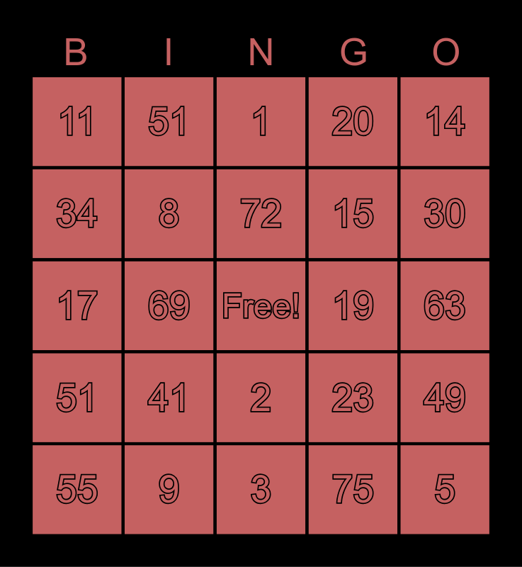 This bingo card has a free space and 24 words: 41, 9, 72, 55, 14, 11, 34, 51, 19, 2, 15, 17, 23, 49, 8, 75, 63, 1, 30, 69, 5, 51, 20 and 3.