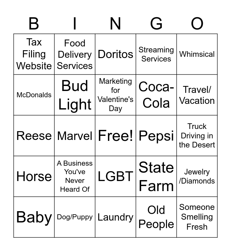 This bingo card has a free space and 29 words: Baby, Sports Betting, Marvel, Taylor Swift, Tax Filing Website, Doritos, Bud Light, A Business You've Never Heard Of, Pepsi, Dog/Puppy, Truck Driving in the Desert, Someone Smelling Fresh, Laundry, Old People, Travel/ Vacation, Overly Patriotic, LGBT, Horse, Whimsical, Reese, State Farm, Budweiser, Coca-Cola, McDonalds, Streaming Services, Food Delivery Services, Jewelry /Diamonds, Marketing for Valentine's Day and Blue Moon.