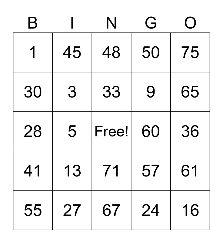 This bingo card has a free space and 24 words: 13, 27, 33, 55, 75, 1, 30, 45, 60, 71, 9, 28, 57, 61, 3, 24, 36, 48, 65, 5, 16, 41, 50 and 67.