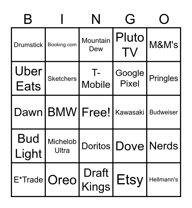 This bingo card has a free space and 37 words: Paramount, State Farm, BetMGM, Sketchers, Nerds, Michelob Ultra, T-Mobile, Popeyes, M&M's, Frito Lay, BMW, Pluto TV, Hellmann's, Budweiser, Uber Eats, Bud Light, Dunkin' Donuts, Mountain Dew, Doritos, Kawasaki, Drumstick, Pringles, E*Trade, Draft Kings, BIC, Etsy, Booking.com, Body Armour, Miller Light, Coors Light, Starry, Oreo, Dawn, Kia, Dove, Google Pixel and Volkswagen.