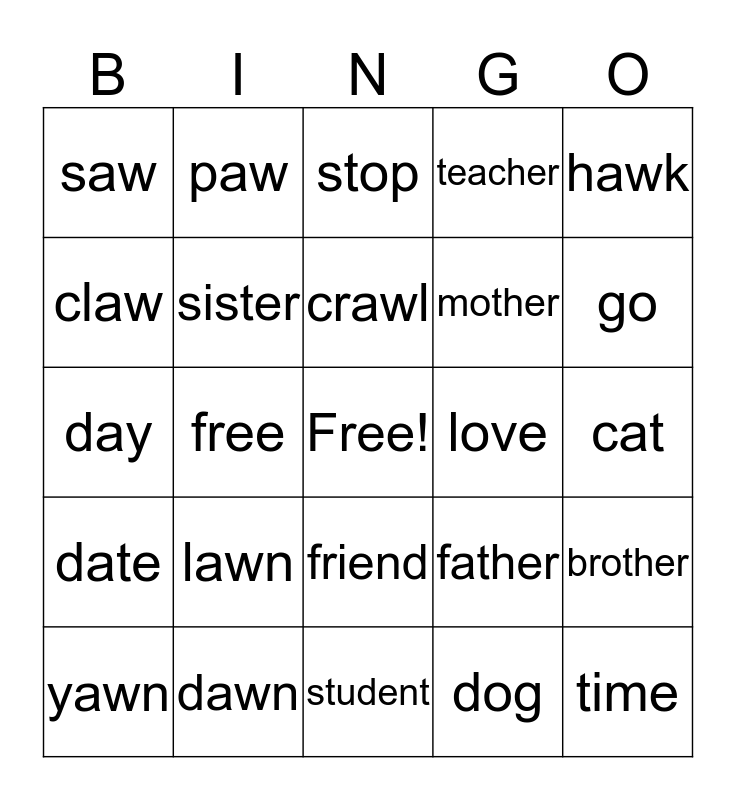 This bingo card has a free space and 24 words: lawn, dawn, crawl, yawn, hawk, saw, claw, paw, love, friend, mother, day, father, brother, sister, dog, cat, stop, go, free, time, date, teacher and student.