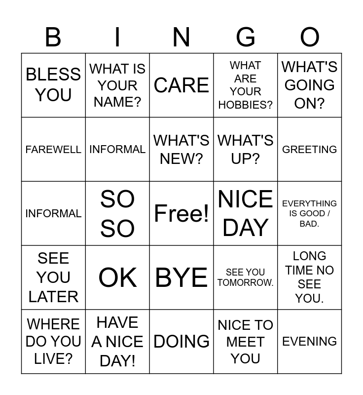 This bingo card has a free space and 26 words: BYE, NICE TO MEET YOU, WHAT'S NEW?, HAVE A NICE DAY!, WHAT'S GOING ON?, BLESS YOU, FAREWELL, WHAT IS YOUR NAME?, EVERYTHING IS GOOD / BAD., SEE YOU TOMORROW., WHAT'S UP?, INFORMAL, LONG TIME NO SEE YOU., WHERE DO YOU LIVE?, SO SO, WHAT ABOUT YOU?, WHAT ARE YOUR HOBBIES?, SEE YOU LATER, CARE, EVENING, GREETING, DOING, NICE DAY, OK, INFORMAL and FRIENDS.