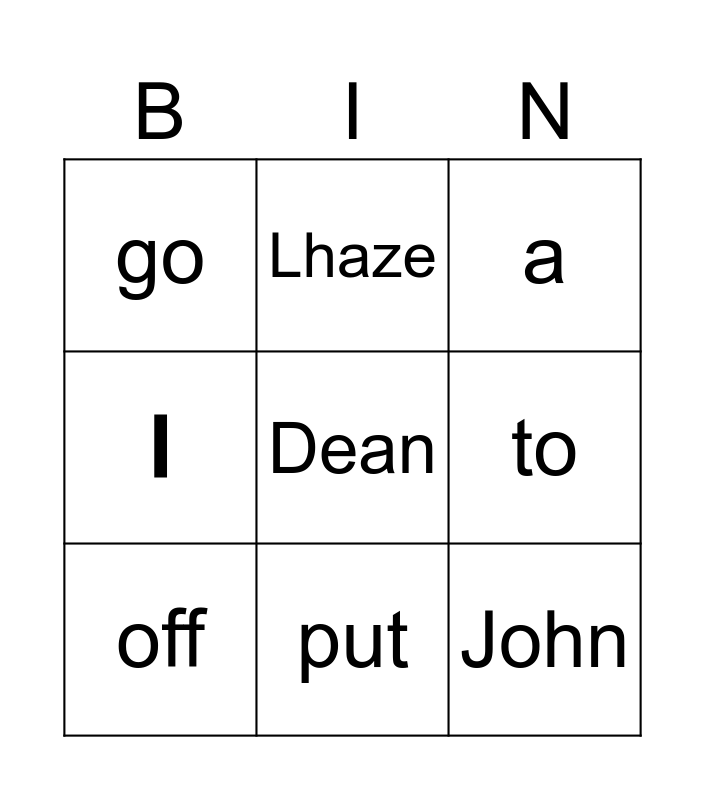 This bingo card has 17 words: am, and, a, go, Free!, I, is, off, put, to, the, Zeke, Dean, Lhaze, John, Moe and Christian.