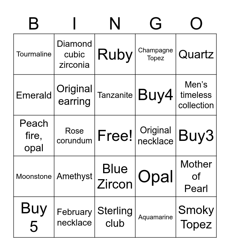 This bingo card has a free space and 24 words: Buy 5, Amethyst, Tanzanite, Aquamarine, Quartz, Tourmaline, Diamond cubic zirconia, Ruby, Original necklace, Buy3, Peach fire, opal, Original earring, Opal, Mother of Pearl, Emerald, February necklace, Sterling club, Champagne Topez, Men’s timeless collection, Moonstone, Rose corundum, Blue Zircon, Buy4 and Smoky Topez.