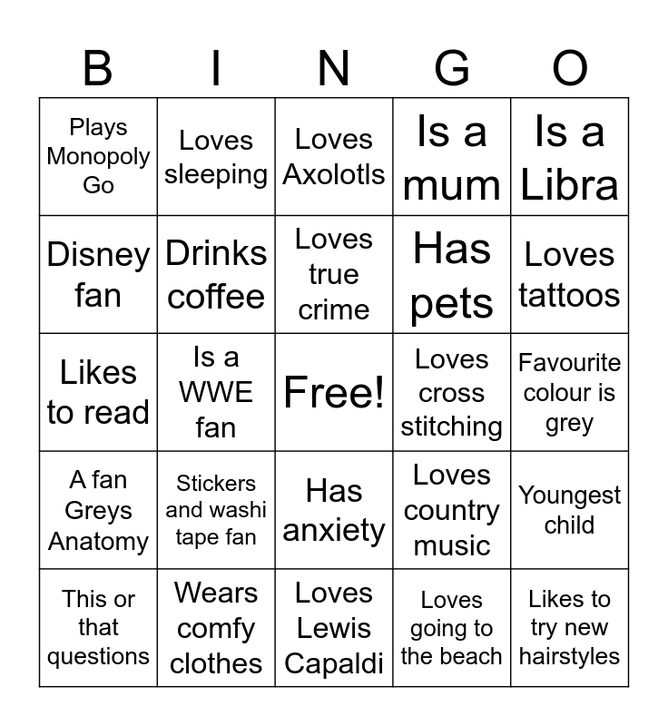 This bingo card has a free space and 24 words: Stickers and washi tape fan, Wears comfy clothes, Loves true crime, This or that questions, Is a Libra, Plays Monopoly Go, Disney fan, Loves sleeping, Loves cross stitching, Has anxiety, Has pets, Likes to read, Loves country music, Youngest child, Drinks coffee, Loves going to the beach, Favourite colour is grey, Loves Axolotls, Loves tattoos, Is a WWE fan, Likes to try new hairstyles, A fan Greys Anatomy, Is a mum and Loves Lewis Capaldi.