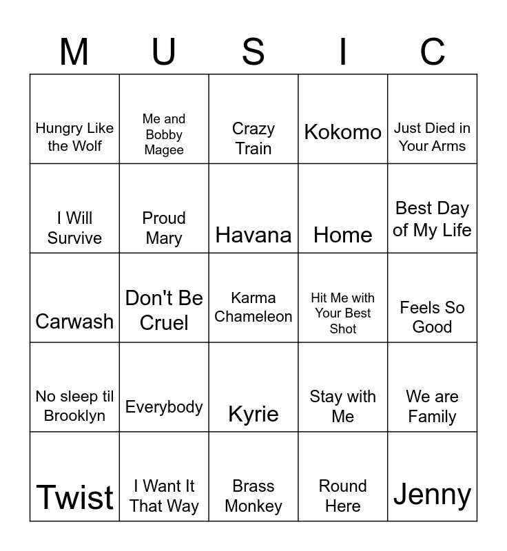 This bingo card has 25 words: Everybody, Brass Monkey, Havana, Twist, Just Died in Your Arms, Hungry Like the Wolf, I Will Survive, Me and Bobby Magee, Hit Me with Your Best Shot, Kyrie, Home, Carwash, Stay with Me, We are Family, Proud Mary, Jenny, Feels So Good, Crazy Train, Best Day of My Life, Don't Be Cruel, Karma Chameleon, I Want It That Way, No sleep til Brooklyn, Kokomo and Round Here.