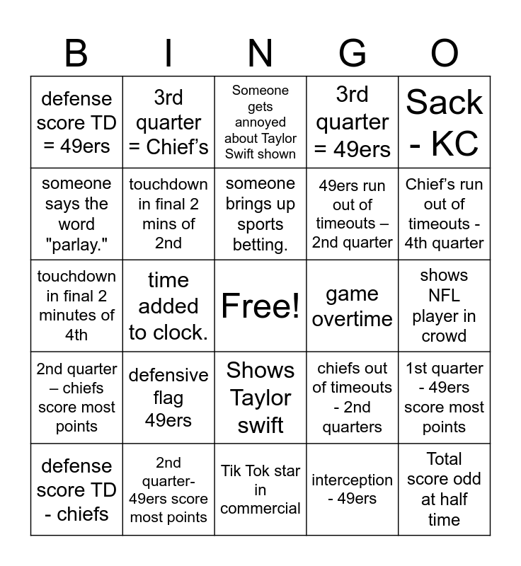 This bingo card has a free space and 76 words: las vegas sign shown, Kardashians Shown at game or comm., Someone gets annoyed about Taylor Swift shown, electric vehicle comm., State farm comm., bud light comm., Doritos comm., Show roger Goodell (owner of NFL), challenge play -KC, Challenge play- 49ers, other sport comm., Someone brings up lions., someone brings up sports betting., someone says the word "parlay.", sports betting comm., time added to clock., tie game at any point., Total score odd at half time, total score even at half time, Sack - KC, sack- 49ers!, touchdown in final 2 minutes of 4th, touchdown in final 2 mins of 2nd, 3rd quarter = Chief’s, 3rd quarter = 49ers, 4th quarter = chefs, 4th quarter= 49ers, first touchdown - KC, first touchdown- 49ers, niners Kick field goal, chiefs Kick field goal, player gets hurt-chiefs, player gets hurt- 49’ers., chiefs out of timeouts - 2nd quarters, Chief’s run out of timeouts - 4th quarter, 49ers run out of timeouts – 2nd quarter, 49ers runout of timeouts – 4th quarter, Shows a lions player in crowd, shows NFL player in crowd, interception - 49ers, interception chiefs, Fumble - 49ers, fumble - chiefs., deebo Samuel-touchdown, R rice -touchdown, B. Aiyuk-touchdown, defense score TD - chiefs, defense score TD = 49ers, Kittle touchdown, KC touchdown, 49ers touchdown, Shows Taylor swift, Usher brings out guest, brock touchdown, CMC touchdown, mahomes touchdown, Kelce touchdown, Pacheco touchdown, defensives flag KC, offensive flag KC, defensive flag 49ers, offensive flag 49ers, Safety Scored, 2-point conversion converted, KC wins, 49’ers wins, game overtime, game score over 47.5, game score under 47.5, 1st quarter -chiefs score most points, 1st quarter - 49ers score most points, 2nd quarter – chiefs score most points, 2nd quarter- 49ers score most points, Las Vegas Sphere is shown, Tik Tok star in commercial and Any player to score 2+ TD.