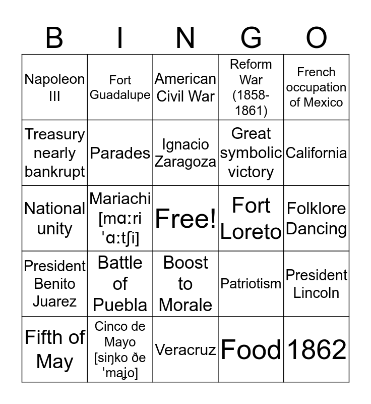 This bingo card has a free space and 24 words: Battle of Puebla, Cinco de Mayo [siŋko ðe ˈmaʝo], Ignacio Zaragoza, Fifth of May, French occupation of Mexico, Napoleon III, Treasury nearly bankrupt, Fort Guadalupe, Fort Loreto, Boost to Morale, Great symbolic victory, National unity, Patriotism, President Lincoln, Parades, Food, Folklore Dancing, American Civil War, California, Mariachi [mɑːriˈɑːtʃi], 1862, President Benito Juarez, Reform War (1858-1861) and Veracruz.