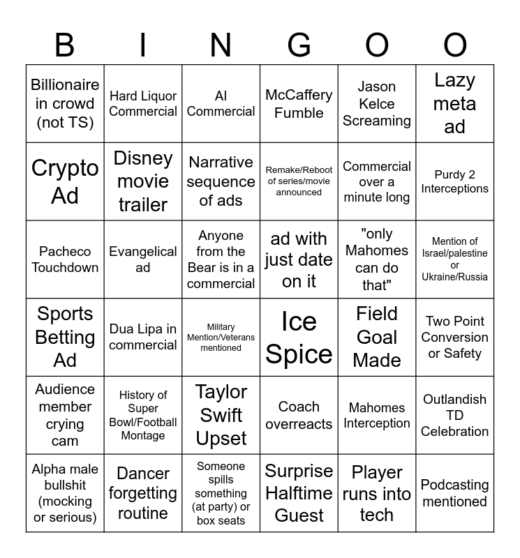 This bingo card has 36 words: Coach overreacts, Taylor Swift Upset, Surprise Halftime Guest, Crypto Ad, Sports Betting Ad, ad with just date on it, Disney movie trailer, Someone spills something (at party) or box seats, Jason Kelce Screaming, Mahomes Interception, Purdy 2 Interceptions, McCaffery Fumble, Outlandish TD Celebration, Evangelical ad, Remake/Reboot of series/movie announced, Billionaire in crowd (not TS), Audience member crying cam, "only Mahomes can do that", Pacheco Touchdown, AI Commercial, Anyone from the Bear is in a commercial, Dua Lipa in commercial, Ice Spice, Military Mention/Veterans mentioned, Field Goal Made, Hard Liquor Commercial, Commercial over a minute long, Dancer forgetting routine, Narrative sequence of ads, Lazy meta ad, Podcasting mentioned, Alpha male bullshit (mocking or serious), Two Point Conversion or Safety, Mention of Israel/palestine or Ukraine/Russia, History of Super Bowl/Football Montage and Player runs into tech.