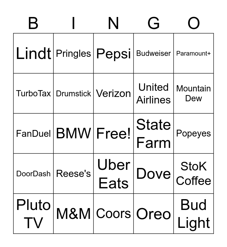 This bingo card has a free space and 47 words: Doritos, Bud Light, Square Space, Coors, Reese's, Etsy, Pringles, Coca-Cola, TurboTax, Google Pixel, Drumstick, Budweiser, StoK Coffee, Dove, Booking.com, Kia, Verizon, State Farm, CrowdStrike, Paramount+, BMW, Oreo, Lindt, United Airlines, e.l.f., Mountain Dew, Pluto TV, Hellmann's Mayo, Uber Eats, DoorDash, Toyota, E*Trade, FCAS, Frito-Lay, Nerds, M&M, Popeyes, Volkswagon, DraftKings, Michelob Ultra, Kawasaki, Pepsi, FanDuel, BetMGM, Silk, Miller Lite and Starry.