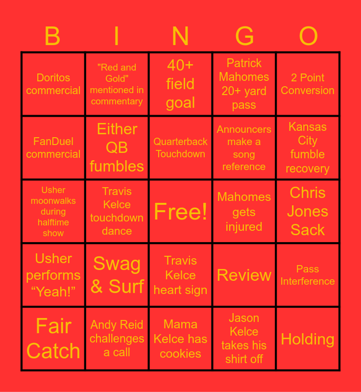 This bingo card has a free space and 61 words: Travis Kelce catches a touchdown pass, Andy Reid challenges a call, A Chiefs player does the "Tomahawk Chop" celebration, Usher performs “Yeah!”, Jason Kelce takes his shirt off, Taylor Swift is shown on TV, Either QB fumbles, Either team misses a field goal, Announcers make a song reference, Taylor’s Capital One ad plays, Patrick Mahomes 20+ yard pass, Kelce/Swift on split screen, FanDuel commercial, Coin Toss: Heads, Mascot Closeup, Doritos commercial, Holding, 2 Point Conversion, 49ers Interception, Quarterback Touchdown, Mahomes gets injured, 40+ field goal, Fair Catch, Pass Interference, NFL Player in commercial, Taylor Swift drops Reputation, Isiah Pacheco 10+ yard rush, Usher brings out surprise guest Ludacris, Kansas City fumble recovery, "Super Bowl Shuffle" reference, Alicia Keys plays piano during performance, Travis Kelce makes a one-handed catch, San Francisco sack on Mahomes, George Kittle touchdown celebration, "Red and Gold" mentioned in commentary, Field goal by San Francisco, Alicia Keys performs, Travis Kelce touchdown dance, Kansas City interception, Usher moonwalks during halftime show, Travis Kelce featured in a Super Bowl commercial, Swag & Surf, Chris Jones Sack, Face Mask, Review, Unnecessary Rough Defense, Football Player Fight!, Punt return for a touchdown, Willie Gay injury, Travis Kelce heart sign, Mama Kelce has cookies, Brock Purdy's number is mentioned, Jason Kelce drinks with fans, Announcers promote Taylor's new album, Tony Romo says something stupid, Jackson Mahomes sighting, Gatorade Shower, "Pacheco runs hard", Holding, Referee Huddle and Tie game after 0-0.