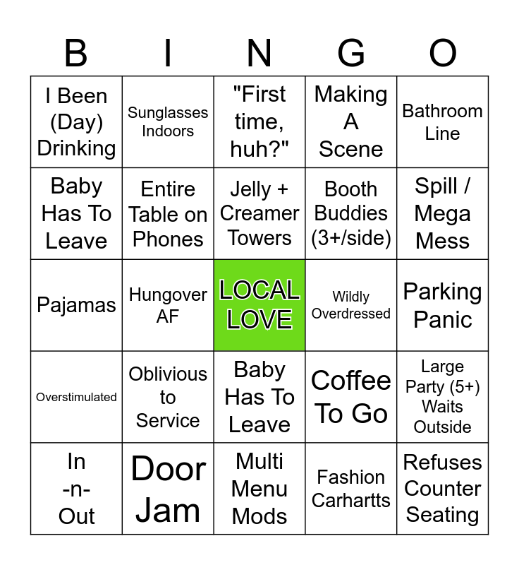 This bingo card has a free space and 32 words: Fashion Carhartts, Selfies + Food Pics, Hungover AF, Retail Creases, Overstimulated, Entire Table on Phones, Bathroom Line, Large Party (5+) Waits Outside, Sunglasses Indoors, The Flag Down, Jelly + Creamer Towers, "First time, huh?", Didn't Want to Be Here, Bored Kids, Wildly Overdressed, Out of State Plates Tic-Tac-Toe, In -n- Out, Pajamas, Baby Has To Leave, Oblivious to Service, Coffee To Go, Milkshake, Parking Panic, Door Jam, Refuses Counter Seating, Making A Scene, Booth Buddies (3+/side), Baby Has To Leave, I Been (Day) Drinking, Multi Menu Mods, Fracture the Check and Spill / Mega Mess.
