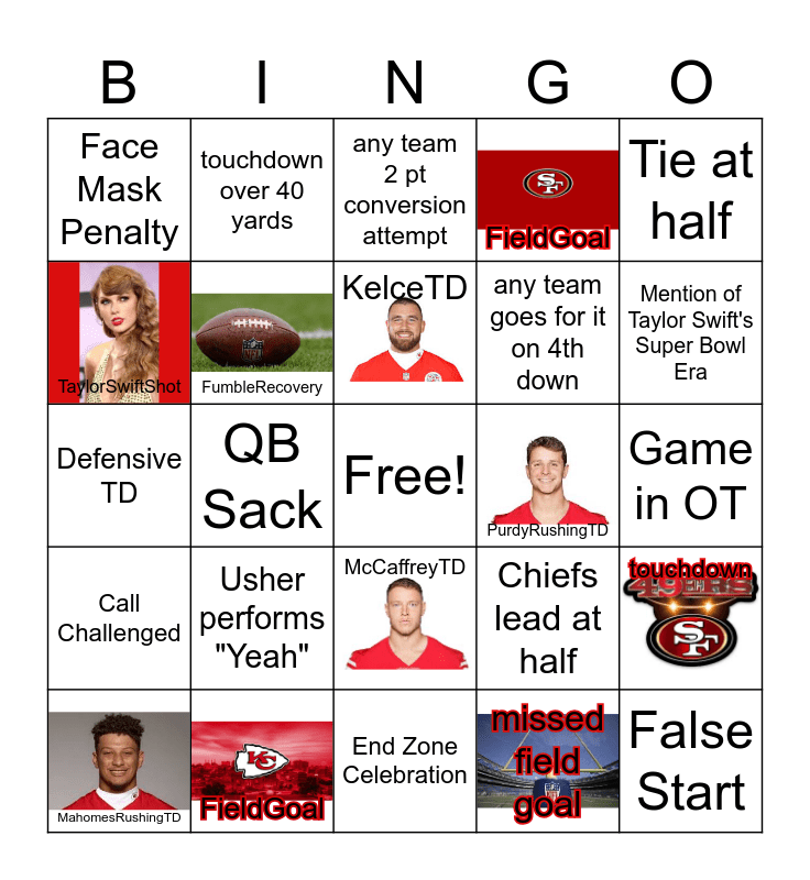 This bingo card has 11 images, a free space and 28 words: touchdown, touchdown, any team goes for it on 4th down, missed field goal, TaylorSwiftShot, any team 2 pt conversion attempt, touchdown over 40 yards, Call Challenged, PurdyRushingTD, MahomesRushingTD, Defensive TD, FieldGoal, FieldGoal, End Zone Celebration, Mention of Taylor Swift's Super Bowl Era, Any team scores 20+ points, Usher performs "Yeah", FumbleRecovery, KelceTD, McCaffreyTD, Face Mask Penalty, Offsides, False Start, QB Sack, Game in OT, Chiefs lead at half, Tie at half and KC Leads at half.