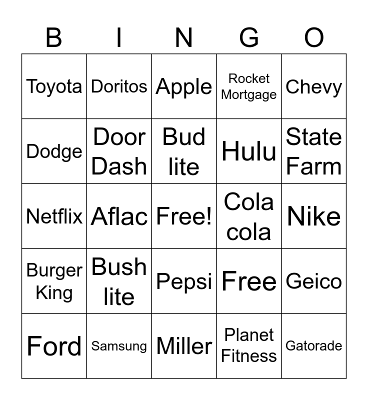This bingo card has a free space and 25 words: Bush lite, Miller, Bud lite, Ford, Chevy, Toyota, Dodge, Doritos, Cola cola, Pepsi, Hulu, Netflix, Free, Geico, Door Dash, Taco Bell, Nike, Apple, State Farm, Aflac, Gatorade, Samsung, Burger King, Rocket Mortgage and Planet Fitness.