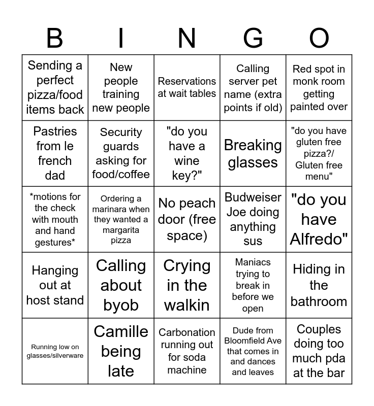 This bingo card has a free space and 24 words: Calling about byob, Camille being late, "do you have a wine key?", Running low on glasses/silverware, Red spot in monk room getting painted over, Sending a perfect pizza/food items back, Pastries from le french dad, New people training new people, Budweiser Joe doing anything sus, Crying in the walkin, Breaking glasses, *motions for the check with mouth and hand gestures*, Maniacs trying to break in before we open, Hiding in the bathroom, Security guards asking for food/coffee, Dude from Bloomfield Ave that comes in and dances and leaves, "do you have Alfredo", Reservations at wait tables, "do you have gluten free pizza?/ Gluten free menu", Ordering a marinara when they wanted a margarita pizza, Couples doing too much pda at the bar, Hanging out at host stand, Calling server pet name (extra points if old) and Carbonation running out for soda machine.