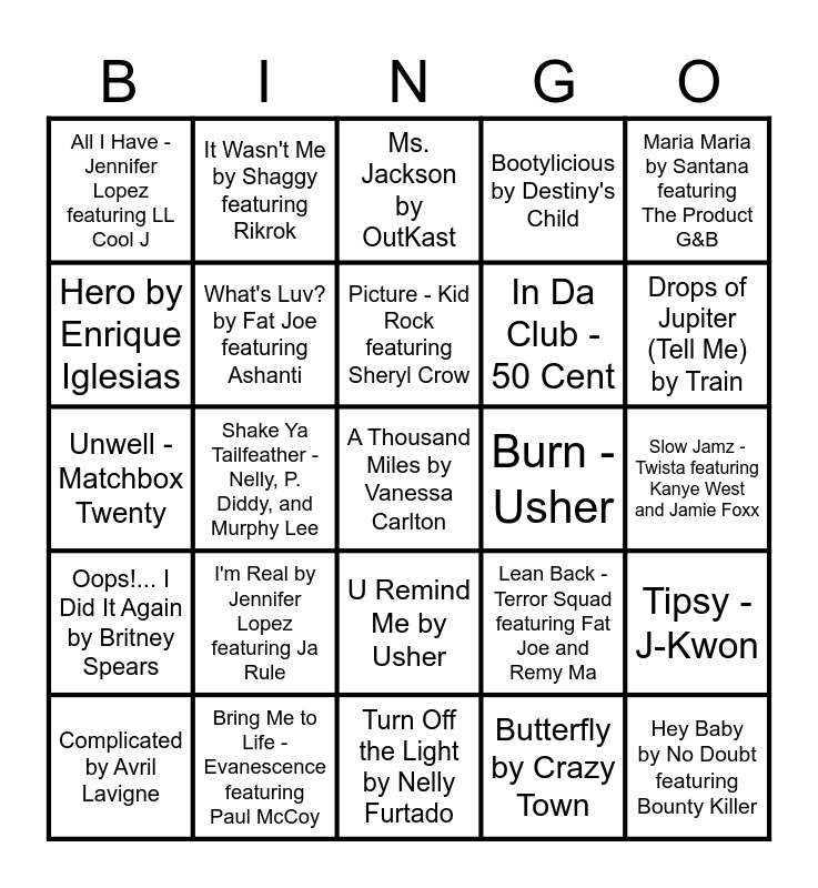 This bingo card has 101 words: Free!, Smooth by Santana featuring Rob Thomas, Maria Maria by Santana featuring The Product G&B, I Wanna Know by Joe, Breathe by Faith Hill, Amazed by Lonestar, Say My Name by Destiny's Child, Everything You Want by Vertical Horizon, What a Girl Wants by Christina Aguilera, Independent Women Part I by Destiny's Child, Higher by Creed, Thong Song by Sisqó, It's Gonna Be Me by *NSYNC, Try Again by Aaliyah, Music by Madonna, I Knew I Loved You by Savage Garden, Oops!... I Did It Again by Britney Spears, Incomplete by Sisqó, Bye Bye Bye by *NSYNC, With Arms Wide Open by Creed, Jumpin', Jumpin' by Destiny's Child, Hanging by a Moment by Lifehouse, Fallin' by Alicia Keys, Let Me Blow Ya Mind by Eve featuring Gwen Stefani, All for You by Janet Jackson, Drops of Jupiter (Tell Me) by Train, Bootylicious by Destiny's Child, I'm Real by Jennifer Lopez featuring Ja Rule, If You're Gone by Matchbox Twenty, Hit 'Em Up Style (Oops!) by Blu Cantrell, It Wasn't Me by Shaggy featuring Rikrok, Ms. Jackson by OutKast, Thank You by Dido, Stutter by Joe featuring Mystikal, Family Affair by Mary J. Blige, U Remind Me by Usher, Love Don't Cost a Thing by Jennifer Lopez, Survivor by Destiny's Child, Butterfly by Crazy Town, Turn Off the Light by Nelly Furtado, Heard It All Before by Sunshine Anderson, Complicated by Avril Lavigne, Hot in Herre by Nelly, Without Me by Eminem, The Middle by Jimmy Eat World, A Thousand Miles by Vanessa Carlton, In the End by Linkin Park, Wherever You Will Go by The Calling, Dilemma by Nelly featuring Kelly Rowland, Hey Baby by No Doubt featuring Bounty Killer, A Little Less Conversation by Elvis Presley vs. JXL, Hero by Enrique Iglesias, Foolish by Ashanti, The Game of Love by Santana featuring Michelle Branch, U Got It Bad by Usher, Sk8er Boi by Avril Lavigne, The Rising by Bruce Springsteen, Underneath It All by No Doubt featuring Lady Saw, Cleanin' Out My Closet by Eminem, Wherever You Will Go by The Calling, What's Luv? by Fat Joe featuring Ashanti, Crazy In Love - Beyoncé featuring Jay-Z, Ignition (Remix) - R. Kelly, Get Busy - Sean Paul, Where Is the Love? - The Black Eyed Peas, In Da Club - 50 Cent, Beautiful - Christina Aguilera, Shake Ya Tailfeather - Nelly, P. Diddy, and Murphy Lee, Bring Me to Life - Evanescence featuring Paul McCoy, Milkshake - Kelis, P.I.M.P. - 50 Cent, Miss You - Aaliyah, All I Have - Jennifer Lopez featuring LL Cool J, Rock Your Body - Justin Timberlake, Picture - Kid Rock featuring Sheryl Crow, Unwell - Matchbox Twenty, Baby Boy - Beyoncé featuring Sean Paul, Landslide - Dixie Chicks, Beautiful - Snoop Dogg featuring Pharrell and Uncle Charlie Wilson, Harder to Breathe - Maroon 5, Crazy - Gnarls Barkley, Yeah! - Usher featuring Lil Jon and Ludacris, Burn - Usher, If I Ain't Got You - Alicia Keys, This Love - Maroon 5, The Way You Move - OutKast featuring Sleepy Brown, Slow Jamz - Twista featuring Kanye West and Jamie Foxx, The Reason - Hoobastank, Goodies - Ciara featuring Petey Pablo, My Immortal - Evanescence, Lean Back - Terror Squad featuring Fat Joe and Remy Ma, Freek-A-Leek - Petey Pablo, Confessions Part II - Usher, She Will Be Loved - Maroon 5, Toxic - Britney Spears, Tipsy - J-Kwon, Hey Ya! - OutKast, I Don't Wanna Know - Mario Winans featuring Enya and P. Diddy, Naughty Girl - Beyoncé, Yeah Yeah Yeah - Usher featuring Lil Jon and Ludacris and My Boo - Usher and Alicia Keys.