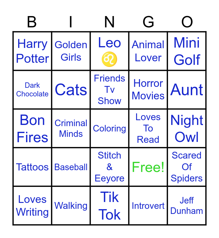 This bingo card has 25 words: Baseball, Tik Tok, Friends Tv Show, Loves Writing, Mini Golf, Harry Potter, Dark Chocolate, Golden Girls, Loves To Read, Stitch & Eeyore, Horror Movies, Bon Fires, Free!, Scared Of Spiders, Cats, Jeff Dunham, Night Owl, Leo ♌️, Aunt, Criminal Minds, Coloring, Walking, Tattoos, Animal Lover and Introvert.