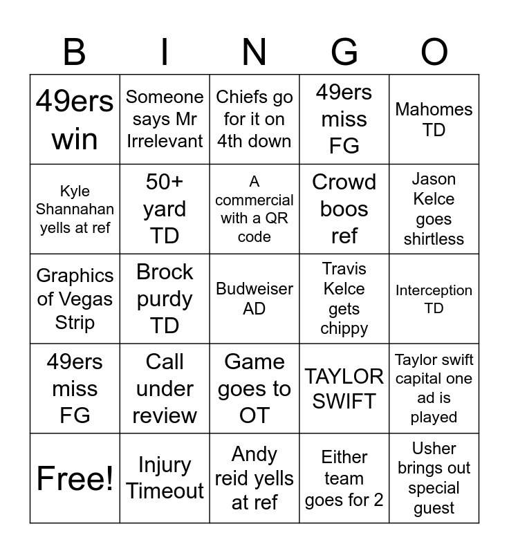 This bingo card has 29 words: Free!, Halftime Show Mishap, Brock purdy TD, Usher brings out special guest, 49ers win, Chiefs go for it on 4th down, 50+ yard TD, Call under review, Travis Kelce gets chippy, Injury Timeout, Interception TD, Budweiser AD, Andy reid yells at ref, Either team goes for 2, Jason Kelce goes shirtless, 49ers go for it on 4th down, Game goes to OT, 49ers miss FG, Mahomes TD, Graphics of Vegas Strip, TAYLOR SWIFT, chiefs win, Crowd boos ref, Kyle Shannahan yells at ref, 49ers miss FG, Someone says Mr Irrelevant, Taylor swift capital one ad is played, A commercial with a QR code and Kelce Celebrates with heart hands.