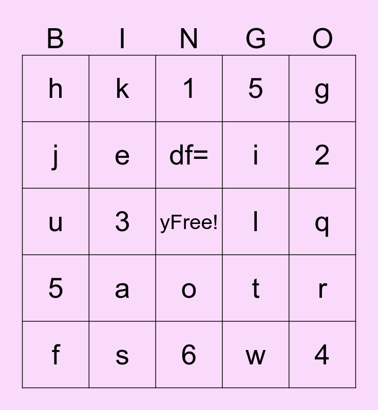 This bingo card has a free space and 24 words: a, s, df=, f, g, h, j, k, l, o, i, u, t, r, e, w, q, 1, 2, 3, 4, 5, 5 and 6.