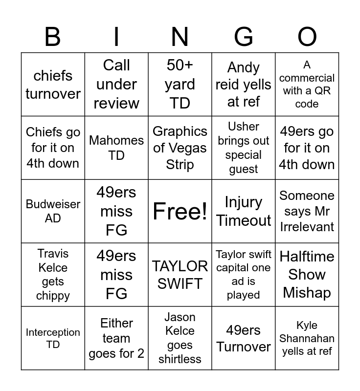 This bingo card has a free space and 28 words: Halftime Show Mishap, Brock purdy TD, Usher brings out special guest, 49ers Turnover, Chiefs go for it on 4th down, 50+ yard TD, Call under review, Travis Kelce gets chippy, Injury Timeout, Interception TD, Budweiser AD, Andy reid yells at ref, Either team goes for 2, Jason Kelce goes shirtless, 49ers go for it on 4th down, Game goes to OT, 49ers miss FG, Mahomes TD, Graphics of Vegas Strip, TAYLOR SWIFT, chiefs turnover, Crowd boos ref, Kyle Shannahan yells at ref, 49ers miss FG, Someone says Mr Irrelevant, Taylor swift capital one ad is played, A commercial with a QR code and Kelce Celebrates with heart hands.
