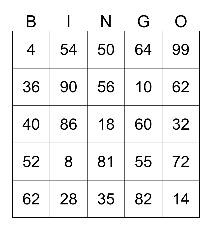 This bingo card has 25 words: 8, 35, 56, 62, 99, 4, 36, 54, 60, 81, 10, 40, 55, 72, 90, 14, 32, 50, 62, 86, 18, 28, 52, 64 and 82.