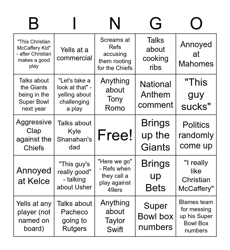 This bingo card has a free space and 24 words: "This guy's really good" - talking about Usher, Talks about Pacheco going to Rutgers, Anything about Tony Romo, Yells at any player (not named on board), Annoyed at Mahomes, "This Christian McCaffery Kid" - after Christian makes a good play, Talks about the Giants being in the Super Bowl next year, Yells at a commercial, Brings up the Giants, "Here we go" - Refs when they call a play against 49ers, National Anthem comment, Aggressive Clap against the Chiefs, Brings up Bets, "I really like Christian McCaffery", "Let's take a look at that" - yelling about challenging a play, Super Bowl box numbers, Politics randomly come up, Screams at Refs accusing them rooting for the Chiefs, "This guy sucks", Talks about Kyle Shanahan's dad, Blames team for messing up his Super Bowl Box numbers, Annoyed at Kelce, Talks about cooking ribs and Anything about Taylor Swift.