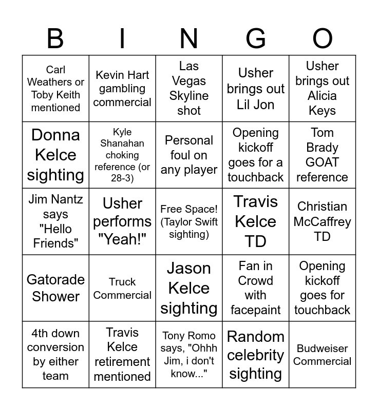This bingo card has a free space and 31 words: Tony Romo says, "Ohhh Jim, i don't know...", Brock Purdy "Mr. Irrelevant" reference, Usher performs "Yeah!", State Farm Commercial, Carl Weathers or Toby Keith mentioned, Las Vegas Skyline shot, Kyle Shanahan choking reference (or 28-3), Fan in Crowd with facepaint, Travis Kelce TD, Random celebrity sighting, Christian McCaffrey TD, Budweiser Commercial, Roger Goodell booed, Tom Brady or Peyton Manning sighting, Tom Brady GOAT reference, Either coach throws challenge flag, Opening kickoff goes for touchback, Truck Commercial, Gatorade Shower, Jason Kelce sighting, Usher brings out Alicia Keys, Brittany or Jackson Mahomes sighting, 4th down conversion by either team, Kevin Hart gambling commercial, Opening kickoff goes for a touchback, Donna Kelce sighting, Usher brings out Lil Jon, Jim Nantz says "Hello Friends", Travis Kelce retirement mentioned, Personal foul on any player and Either coach throws challenge flag.