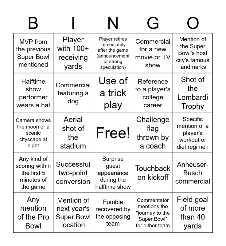 This bingo card has a free space and 50 words: Touchdown is scored, Field goal of more than 40 yards, Interception, Fumble recovered by the opposing team, Successful two-point conversion, Player with 100+ rushing yards, Player with 100+ receiving yards, Sack on the quarterback, Halftime show performer wears a hat, Celebrity shown in the audience, Commercial featuring a dog, Commercial for a new movie or TV show, Anheuser-Busch commercial, Touchback on kickoff, Player does a signature dance move after scoring, Mention of a player's charity work or off-field achievements, Use of a trick play, Challenge flag thrown by a coach, Penalty for roughing the passer, Mention of the Super Bowl's host city's famous landmarks, Aerial shot of the stadium, Commentator mentions the "journey to the Super Bowl" for either team, MVP from the previous Super Bowl mentioned, Reference to a player's college career, Commercial that makes you cry, Celebration penalty, Shot of the Lombardi Trophy, Mention of a record that could be broken during the game, Player retires immediately after the game (announcement or strong speculation), Surprise guest appearance during the halftime show, Player injury timeout, Fan with elaborate face paint shown on TV, A play is reviewed and overturned, Game goes into overtime, Mention of next year's Super Bowl location, Kick return longer than 30 yards, Player mentioned is playing in their first Super Bowl, Mention of the temperature at game time, Commercial promotes sustainability or eco-friendliness, Specific mention of a player's workout or diet regimen, Halftime show has a fireworks display, Player gives a shout-out to family or hometown during a post-game interview, Mention of how many Super Bowls each head coach has won, "Hometown hero" story segment about a player, Any mention of the Pro Bowl, Camera shows the moon or a scenic cityscape at night, Player or coach is shown praying or in a moment of reflection, A famous former player is mentioned or shown, Any kind of scoring within the first 5 minutes of the game and Mention of a unique or new technology used during the game (e.g., camera tech, analytics).
